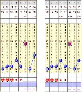 More adjustments. That's what I get for staying out late and sleeping in till 7 -- sad that we consider 7am "sleeping in," isn't it? I usually have found that my normal waking time +/- one hour doesn't need to be adjusted at all, but today it makes more sense at 97.3 (adjusted) than at 97.5 (unadjusted)... perhaps it just seems like a big difference now because the rest of my chart (minus my other adjusted day) has been fairly steady and even?